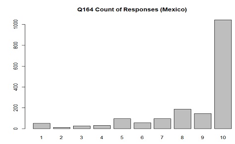 The distribution of responses in Mexico for Q164(importance of god) where 1 is "Not at all important" and 10 is "Very important"